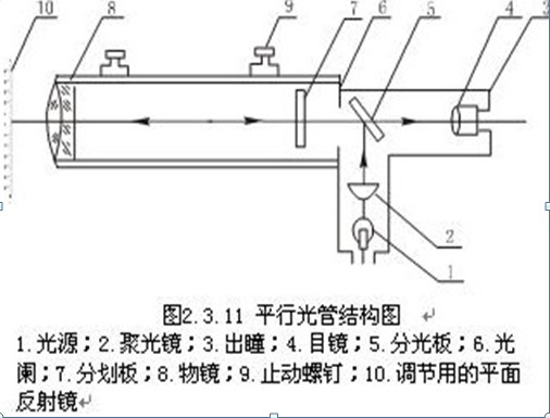 由光源發(fā)出的光束經(jīng)分光板5反射,照亮分劃板7。分劃板處于物鏡的焦平面上,因而由分劃板上每一點(diǎn)發(fā)出的光經(jīng)過(guò)平行光管物鏡后,形成一束平行光。為了準(zhǔn)確調(diào)整分劃板的位置, 在平行光管上附有高斯目鏡和調(diào)整用的平面反射鏡。